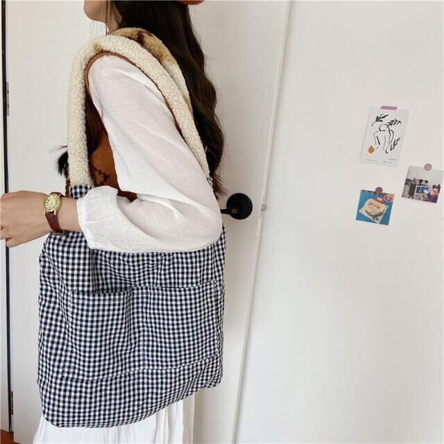 クマ トートバッグ くまちゃん もこもこ ベア チェック柄 ベア ブラック
