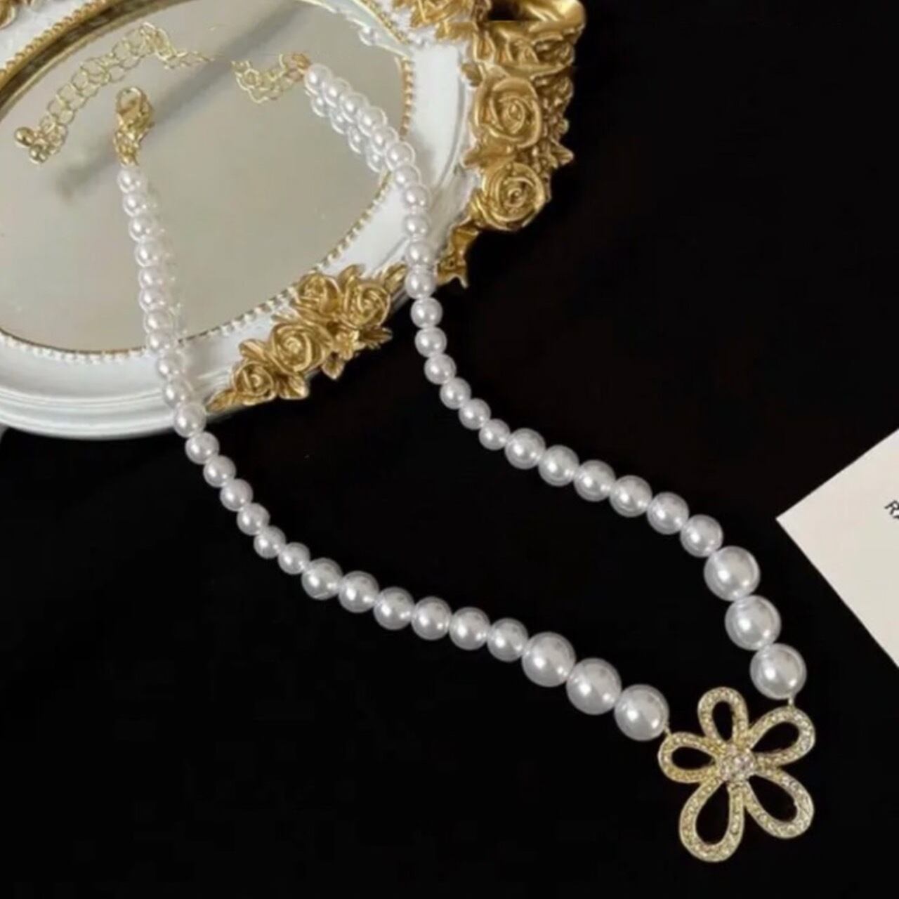 キラキラの大きめなお花に上品なパールを合わせた大人可愛いネックレスです♡