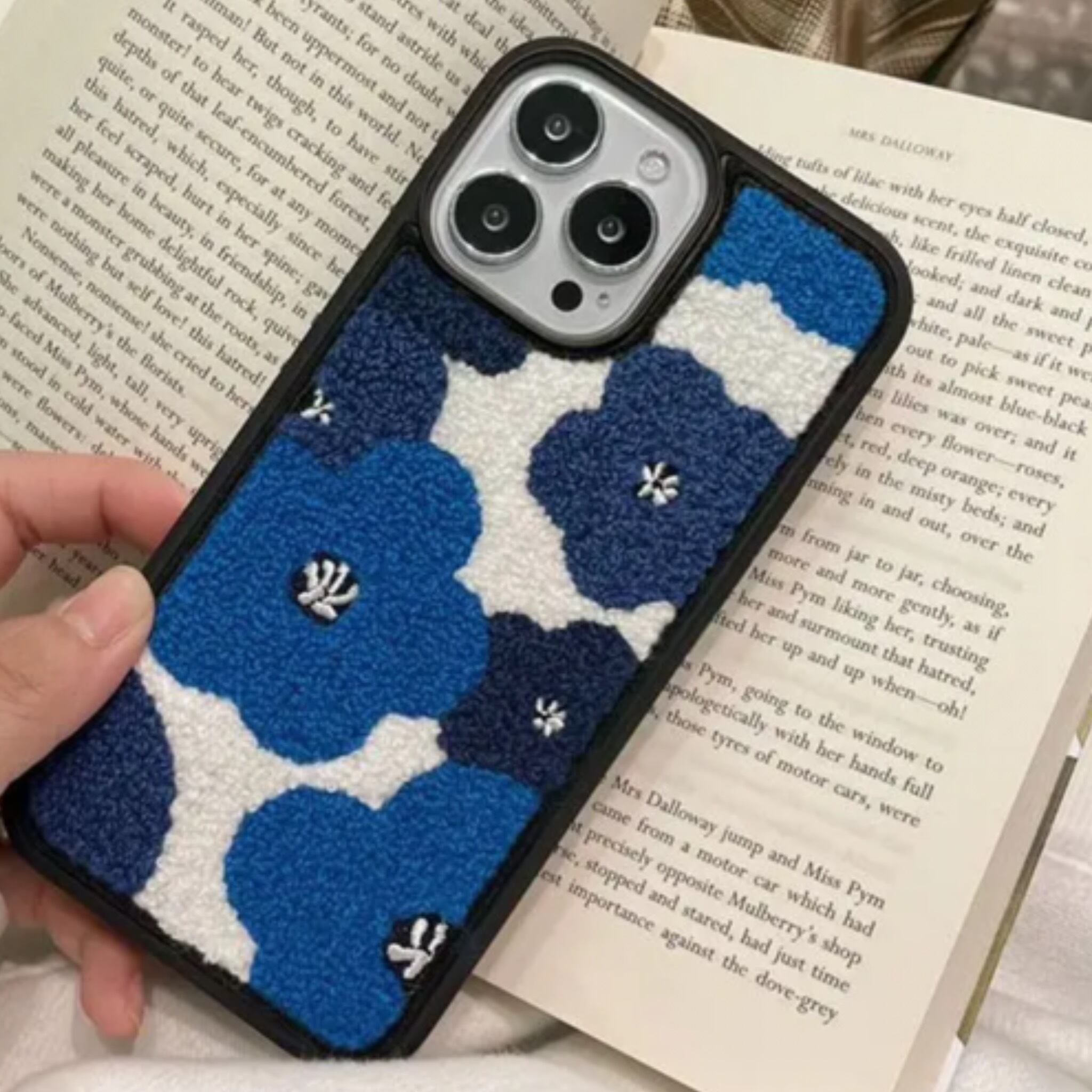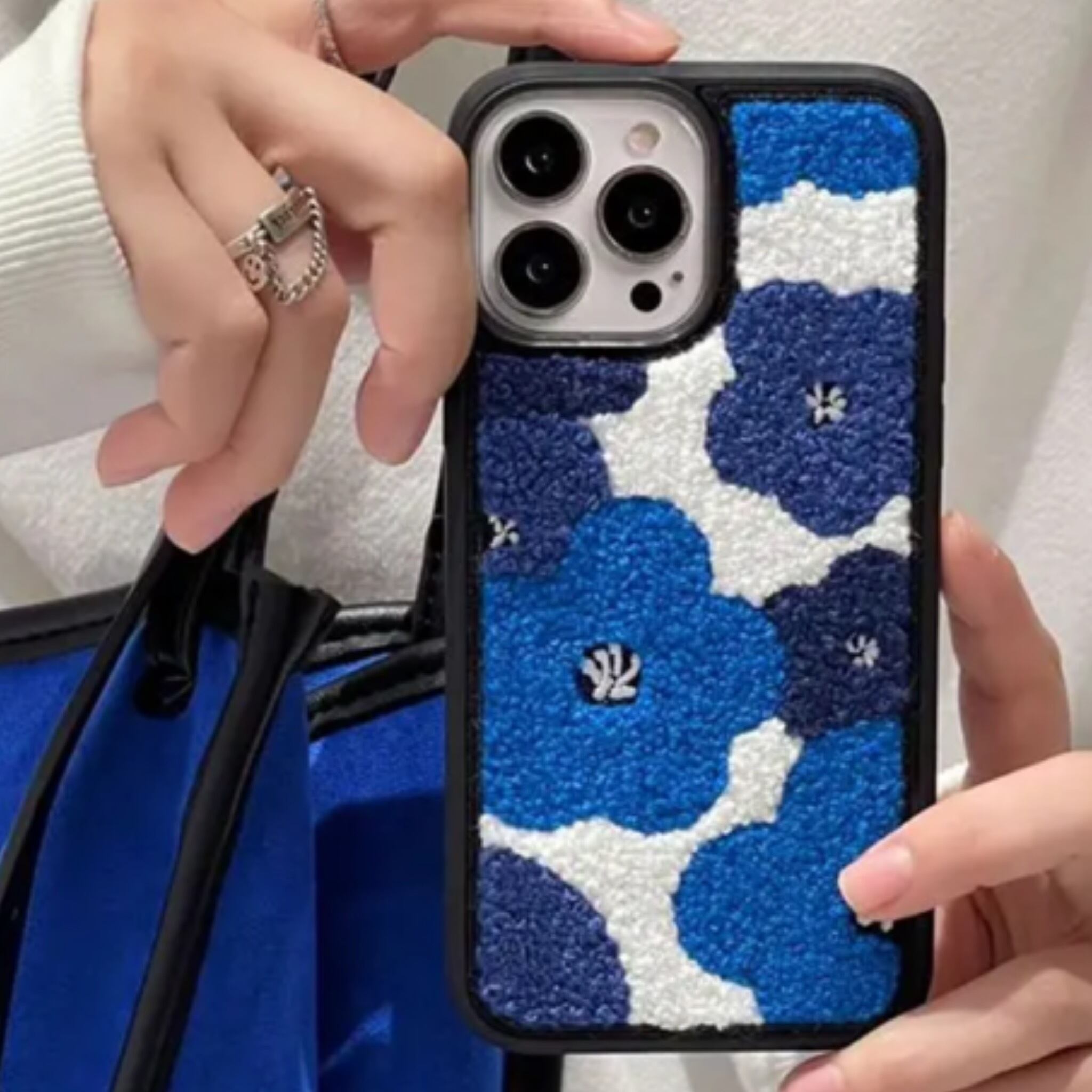 青色の花柄パイル地のお洒落なiPhoneケースとなります!とっても可愛い商品です。