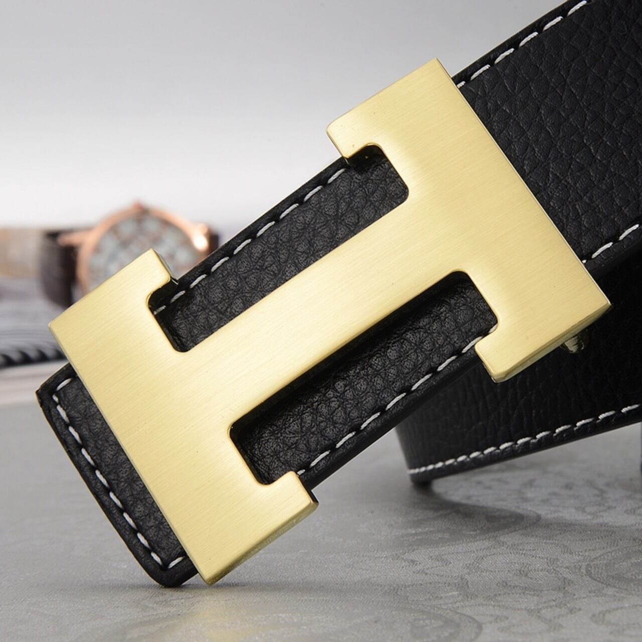 paypayのみ ゴールド メンズベルト Hベルト バックル ブラック 牛革