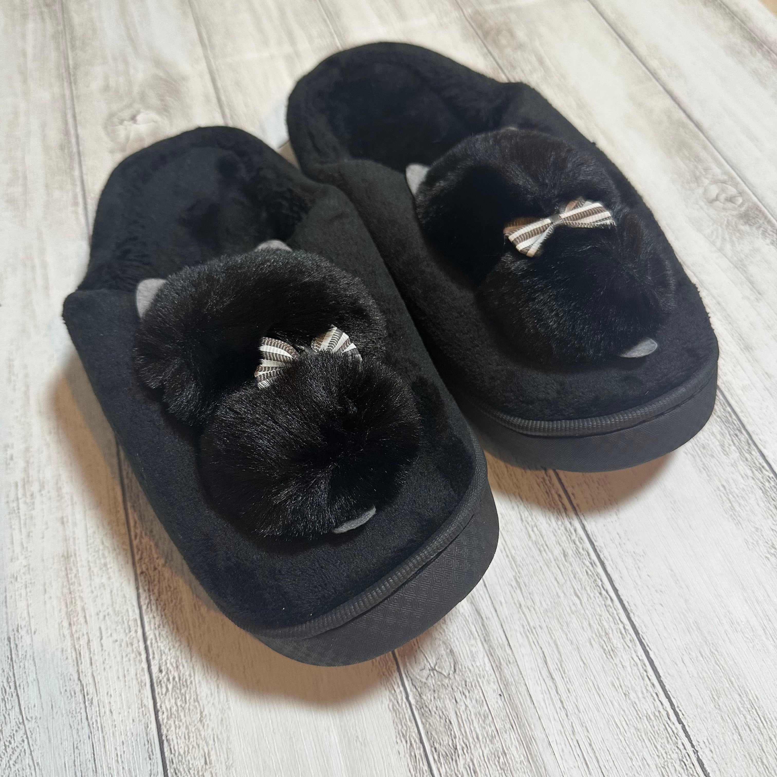 猫 ネコ ルームシューズ 黒猫 リボン ブラック スリッパ ふわふわ 韓国 秋冬