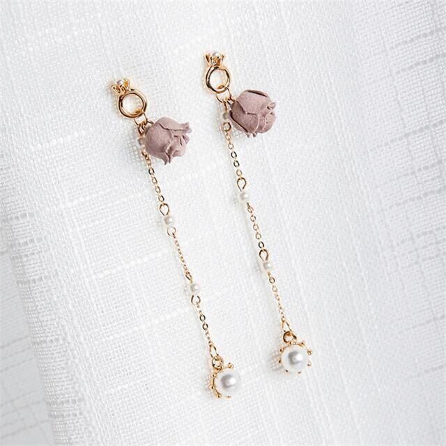 ピアス バラ 薔薇 ローズ ピンク 両耳 韓国 パール チェーン