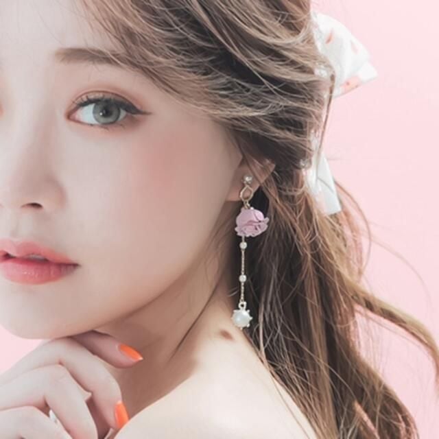 ピアス バラ 薔薇 ローズ パープル 両耳 韓国 パール チェーン