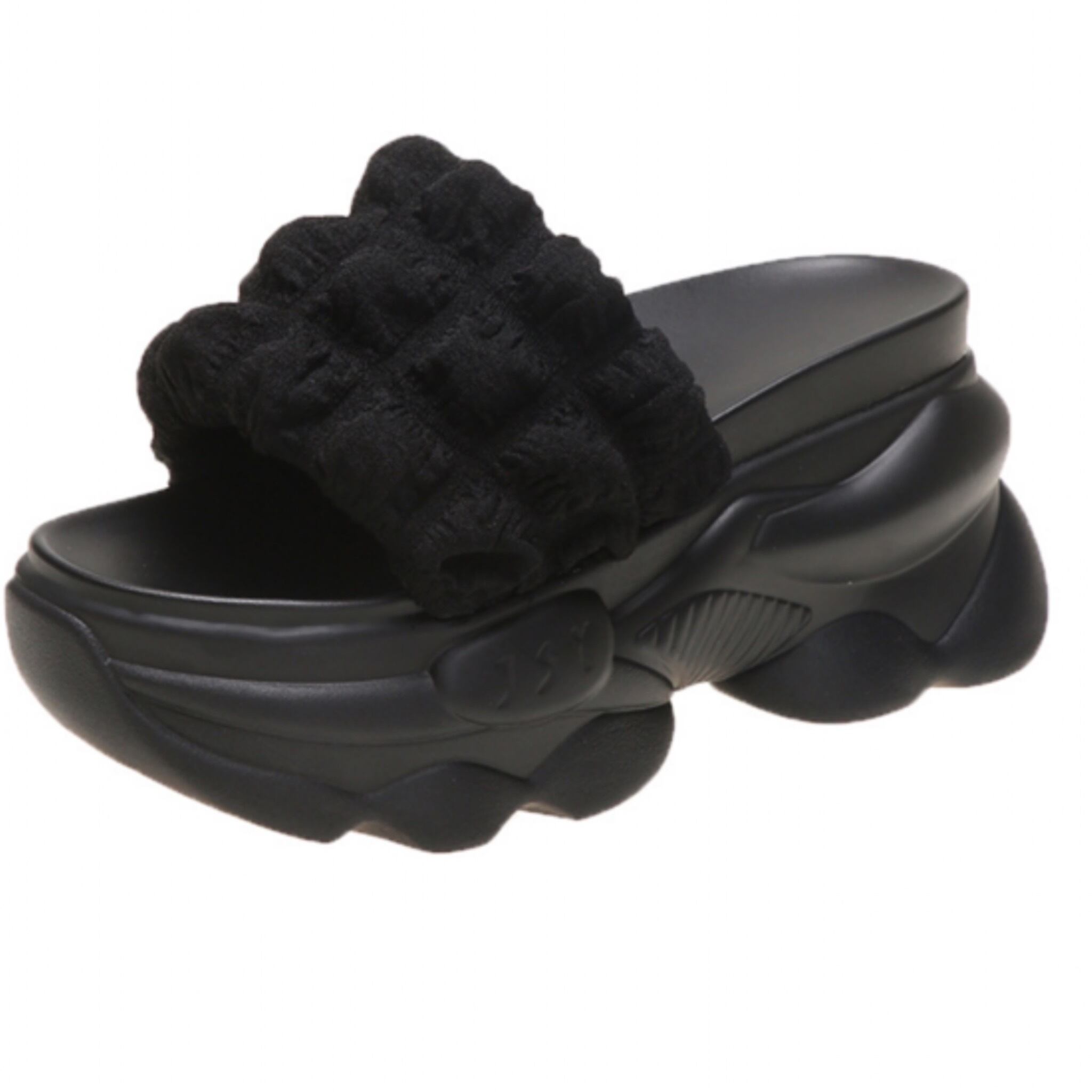 低身長の方におすすめの厚底ウェッジソールがスタイルアップ効果を与えます。衝撃吸収性の高いクッションインソールで履き心地はふんわり。