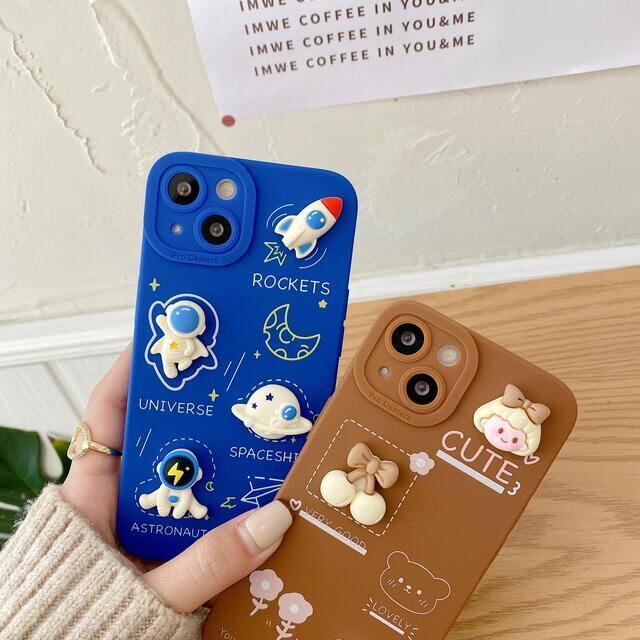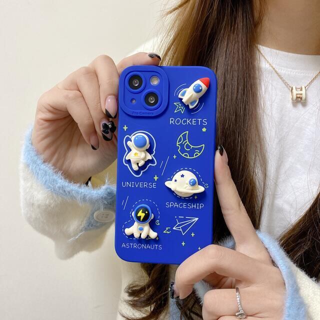 ビビッドなブルーにふわふわ飛んでる立体的な宇宙飛行士が可愛いiPhoneケース♡