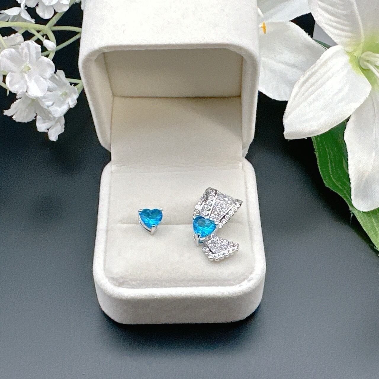 リボン ブルー ハート アシンメトリー ピアス クリア ジルコニア