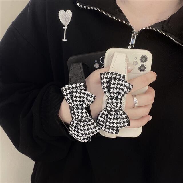 iPhoneケース13 韓国 チェックリボン ベルト 量産 千鳥柄 ホワイト