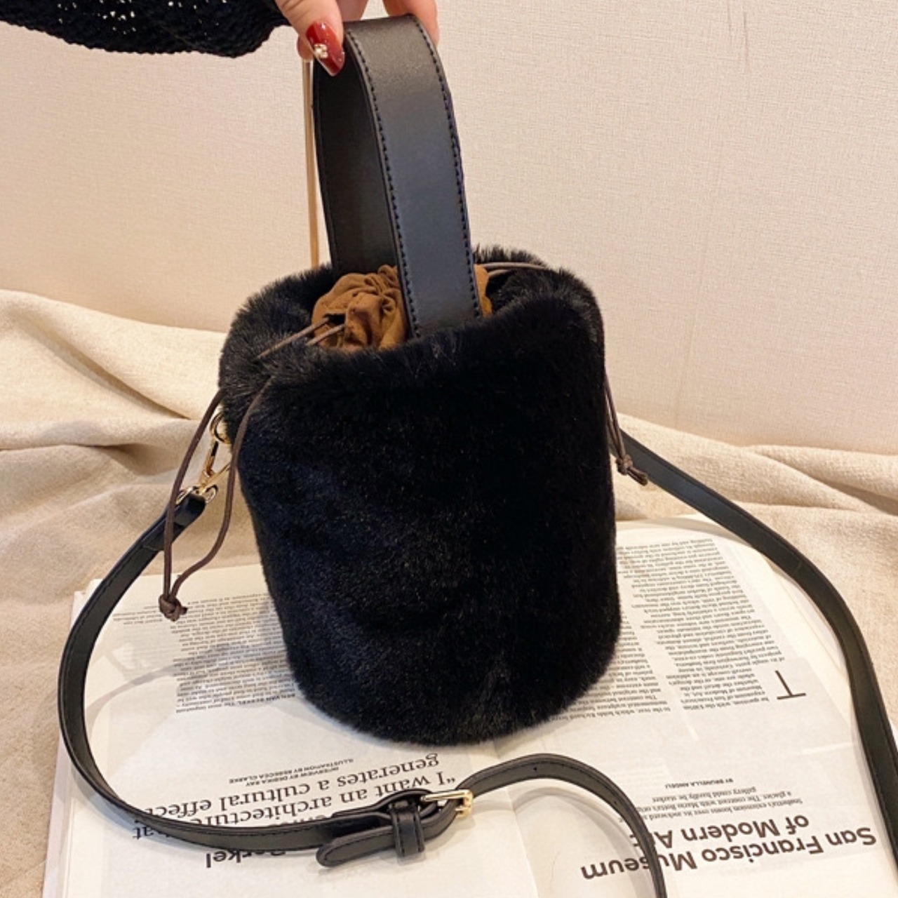 もこもこ ブラック ショルダーバッグ ハンドバッグ ファー 斜めがけ 可愛い