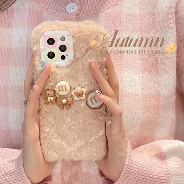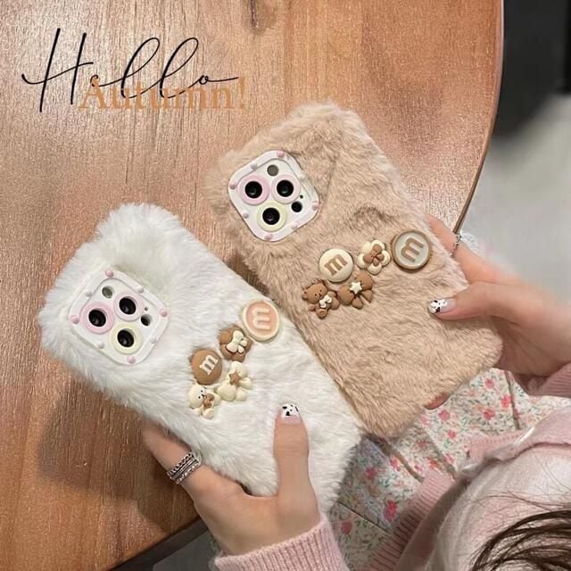 iPhone13promax 対応 クマ もこもこ リボン カバー スマホケース ブラウン