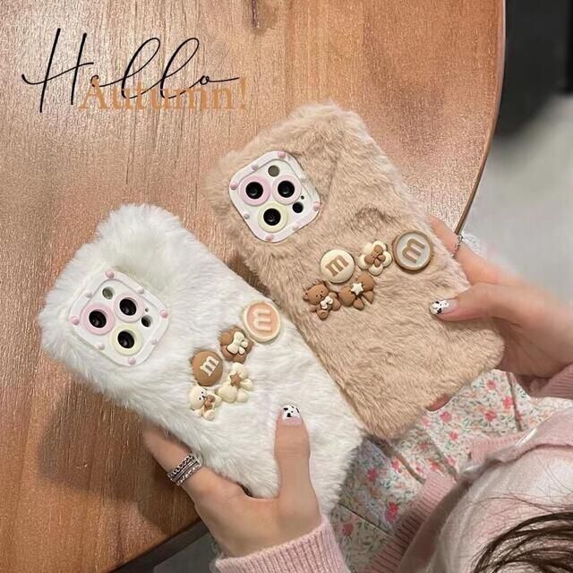 iPhone13 対応 クマ もこもこ リボン カバー スマホケース ホワイト