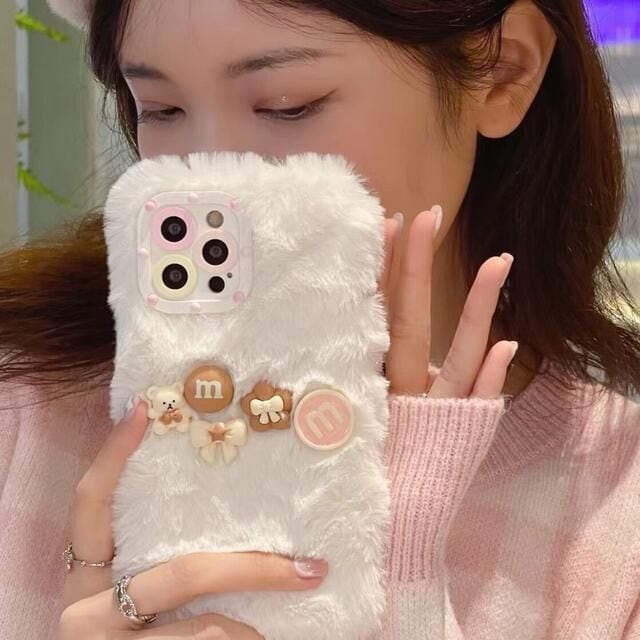 iPhone11 対応 クマ もこもこ リボン カバー スマホケース ホワイト