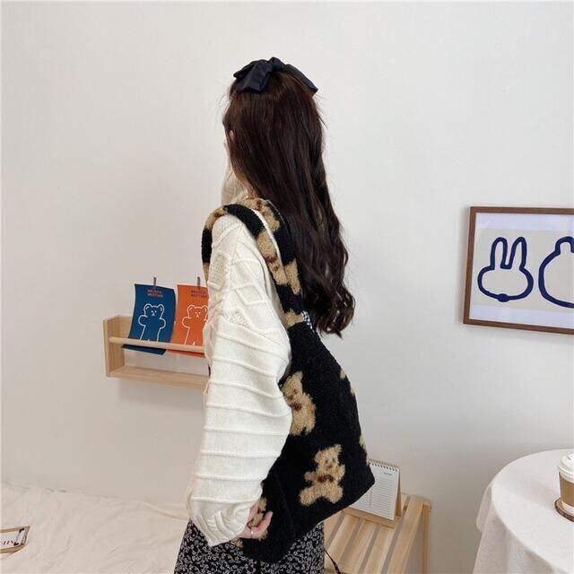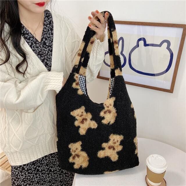 クマ トートバッグ くまちゃん もこもこ ベア チェック柄 ベア ホワイト